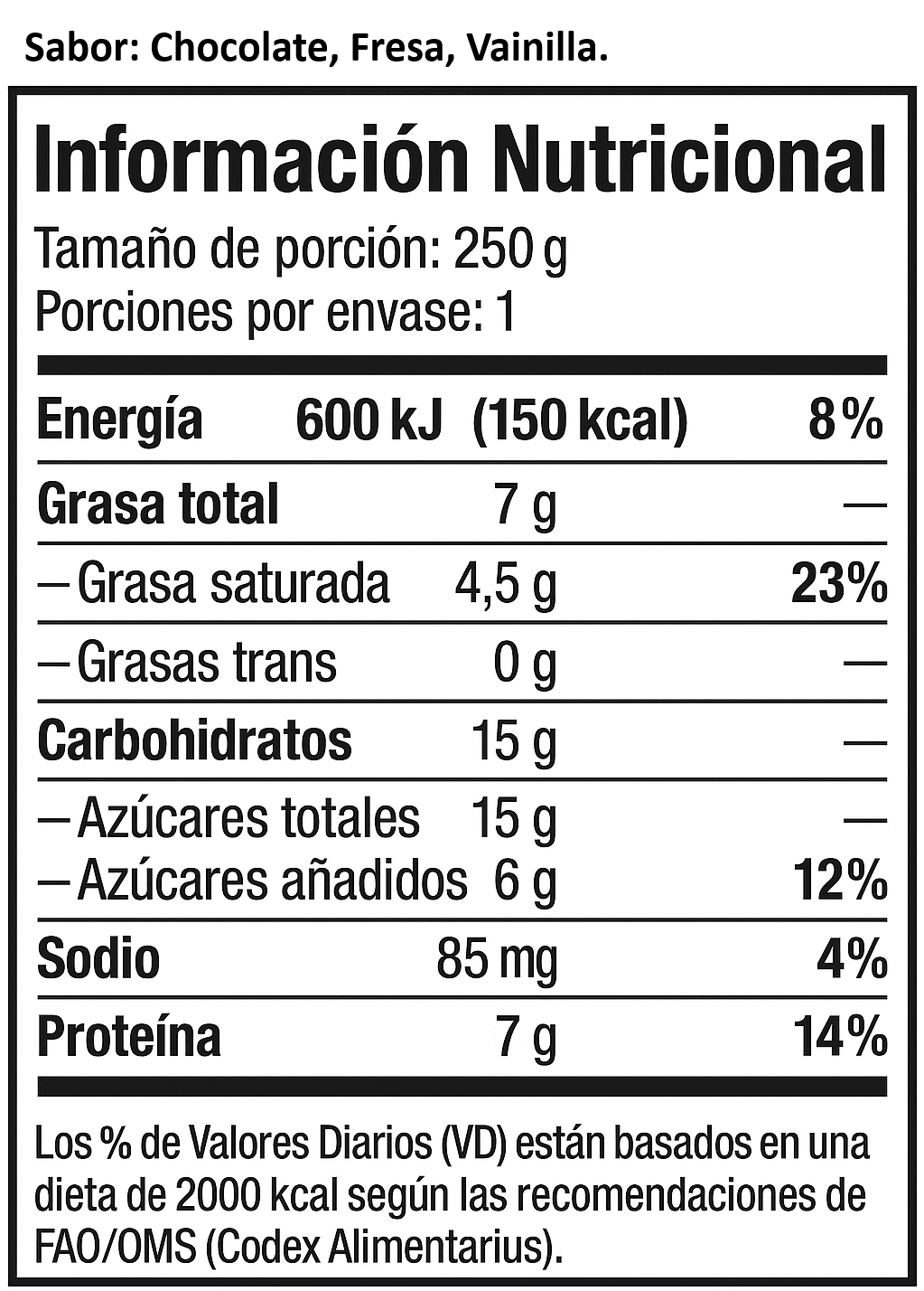 Chocolate: Leche entera reconstituida, azúcar, cultivos de bacterias lácticas, cacao en polvo alcalinizado; estabilizantes: pectina y carragenina; cacao natural (saborizante).